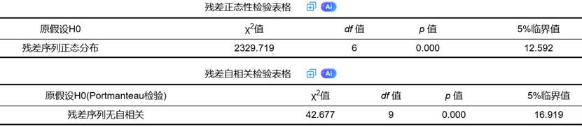 残差诊断是验证模型设定正确性的关键步骤,包括残差正态性检验和自相关检验: