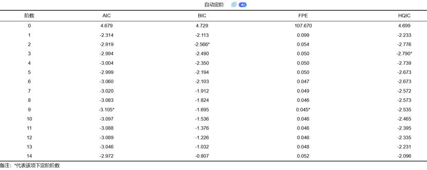滞后阶数选择涉及过拟合与欠拟合的权衡:阶数过低会遗漏重要动态关系,阶数过高则会增加估计不确定性并降低预测精度。SPSSAU同时计算四种信息准则,为用户提供全面参考,最终基于多数原则确定最优滞后阶数。分析结果示例如下: