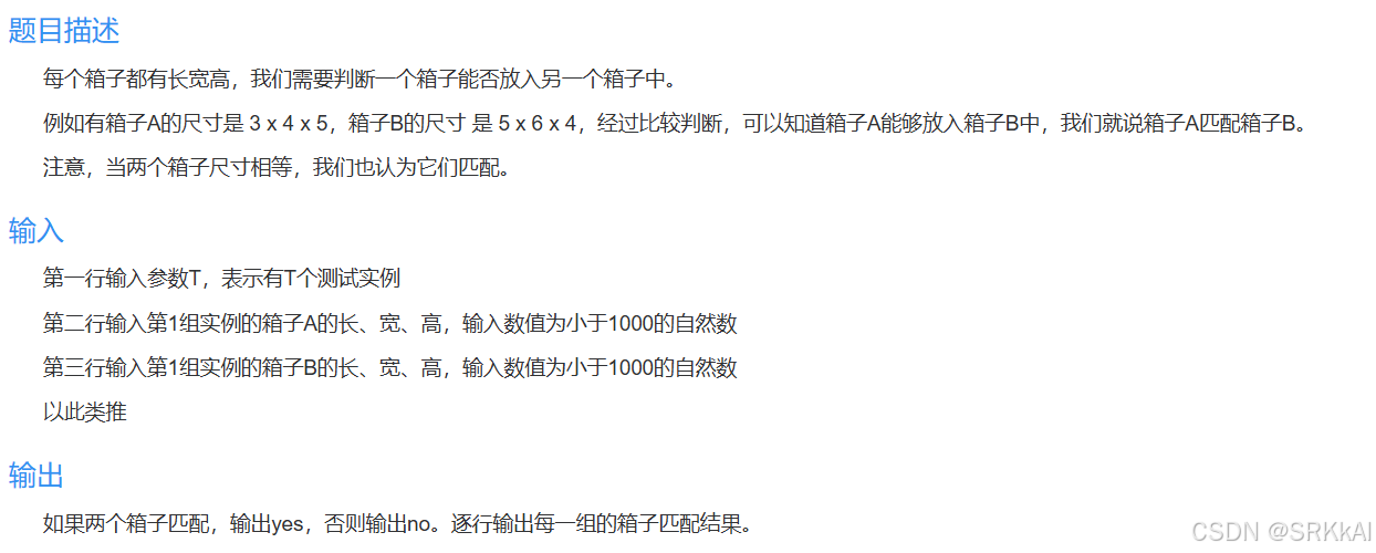 这里我是先对箱子的长宽高进行一个从小到大的排序,然后两个箱子依次进行比较。