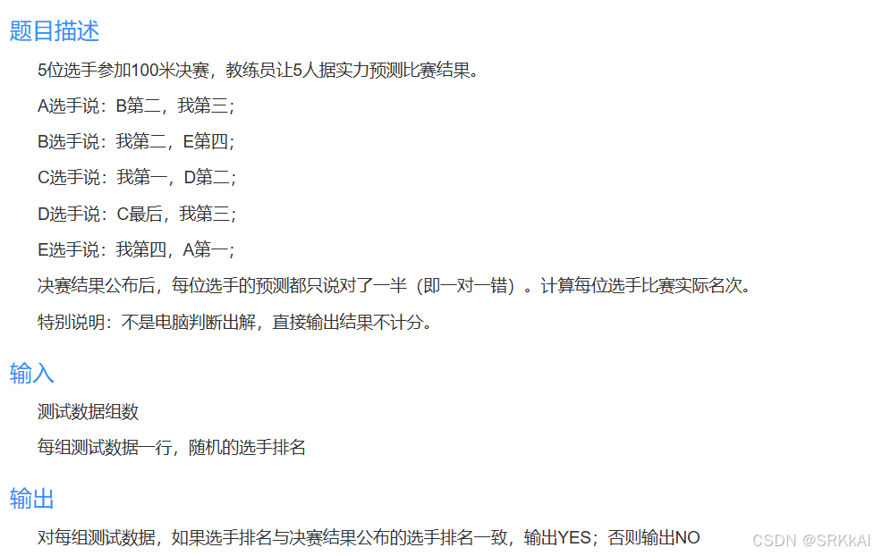 //先用n重for循环,赋值数字去假设他们的排位,再根据“一半错一半对”的题目条件对排位名次进行分析 ,最后得出正确的排位名次