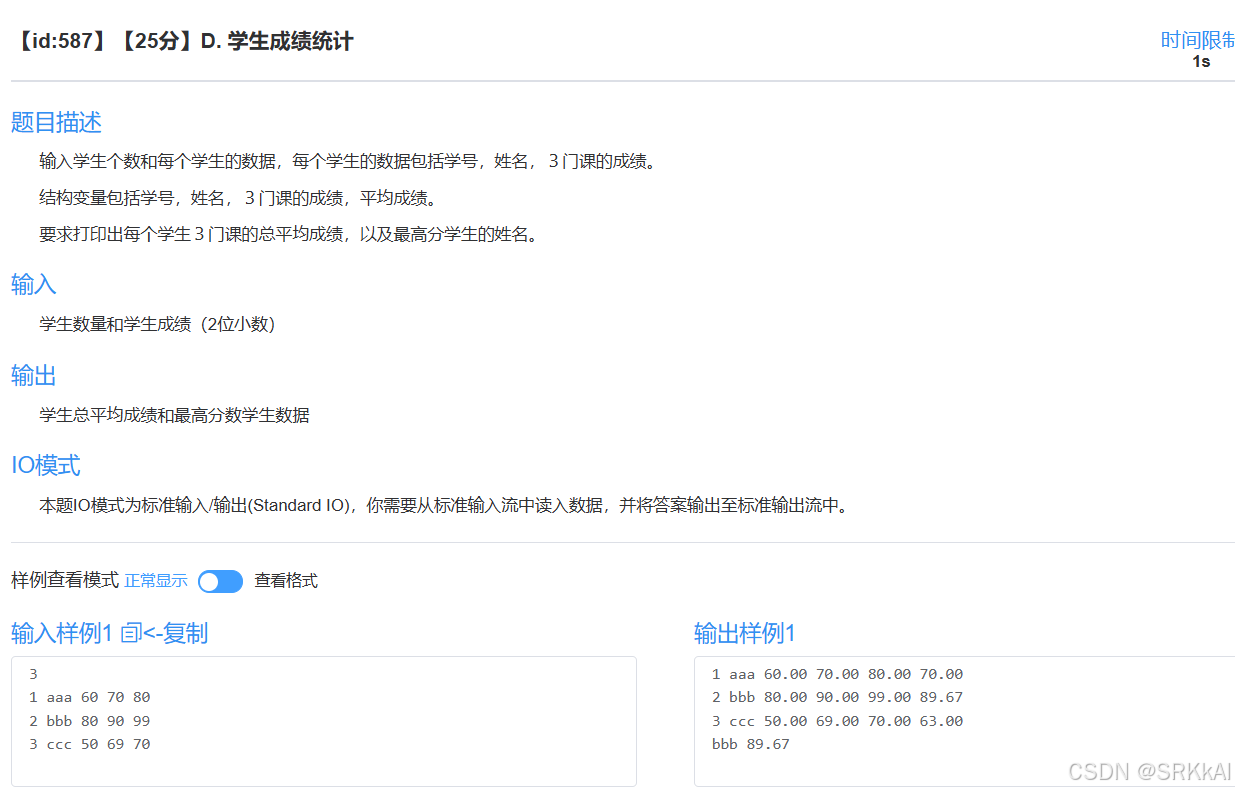 scanf("%s %s %f %f %f", students[i].id, students[i].name, &students[i].scores[0], &students[i].scores[1], &students[i].scores[2]);