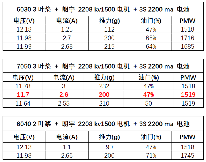 从初步测试结果看,6045三叶桨以及7050三叶桨推力200g时候的电流大概2.7A,工作电流降低了近30%,效果是比较明显的。在后期试飞中将采用上述规格组合进行测试。