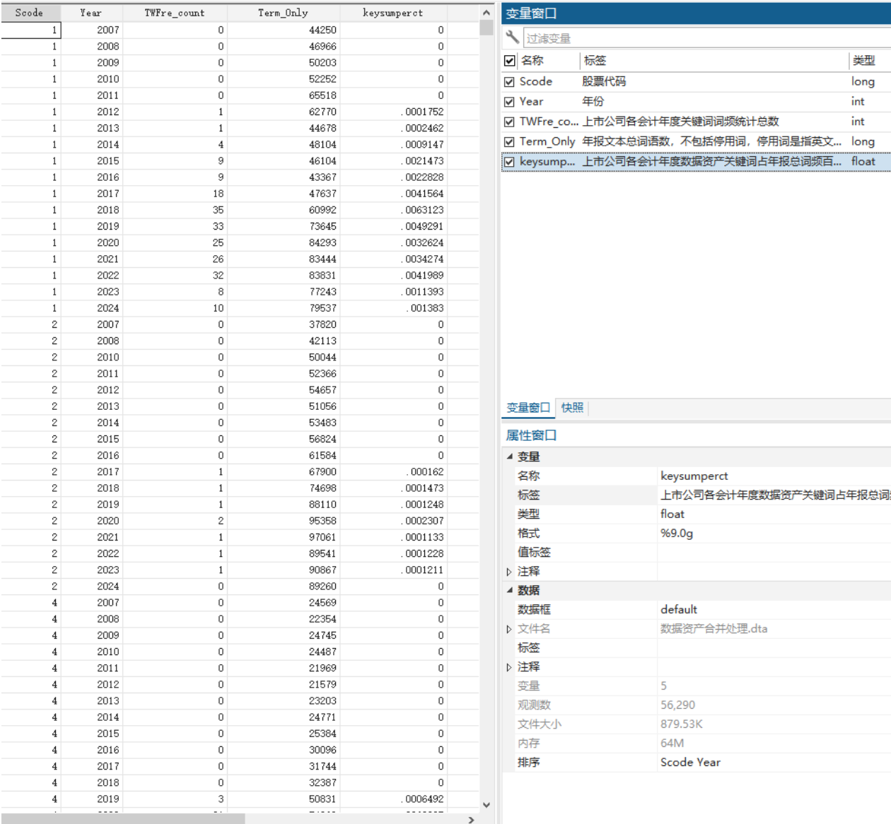 01、数据介绍参考牛彪等文献对数据资产信息披露程度进行测算,数据资产已成为企业的重要战略资源,企业的数据资产信息披露也受到社会的广泛关注。研究发现,数据资产信息披露能降低审计费用。数据资产信息披露能缓解企业融资约束、驱动企业技术创新、提高企业的声誉和增加审计师的工作投入,从而能降低审计师的业务风险和审计风险,进而可降低审计费用。数据名称:数据资产信息披露程度数据年份:2007-2024年02、数据指标及参考文献股票代码;年份;上市公司各会计年度关键词词频统计总数;年报文本总词语数,不包括停用词,停用词是指英文单词、标点符号和无意义中文单词(例如:哎呀,不仅,而且)等;上市公司各会计年度数据资产关键词占年报总词频百分比;牛彪 , 于翔,苑泽明等.数据资产信息披露与审计师定价策略[J].当代财经:1-10[2024-01-16]03、