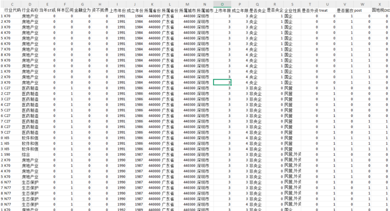 01、数据介绍参考刘贯春做法将2017年视为政策冲击的第一年,当年及之后年份赋值为1,此前年份赋值为0。国地税合并前企业所得税由地税局征管的企业赋值为1(实验组),其余赋值为0(对照组)。具体划分依据2008年后注册企业:按流转税类型归属(增值税→国税局,营业税→地税局),合并后新税务机构延续国税局管理模式,故地税原管企业受影响显著,符合实验组特征。数据名称:国地税合并DID数据数据年份:2009-2023年02、数据指标及参考文献id year 行业代码证监会2012年版 行业名称证监会2012年版 当年ST或PT为1否则为0 样本区间内ST或PT为1否则为0 金融业为1否则为0 资不抵债为1否则为0 上市年份 成立年份 所属省份代码 所属省份 所属城市代码 所属城市 上市年限 成立年限 是否央企 是否央企2 企业性质 是否外资 treat 是否营改增行业 post 国地税DID03、
