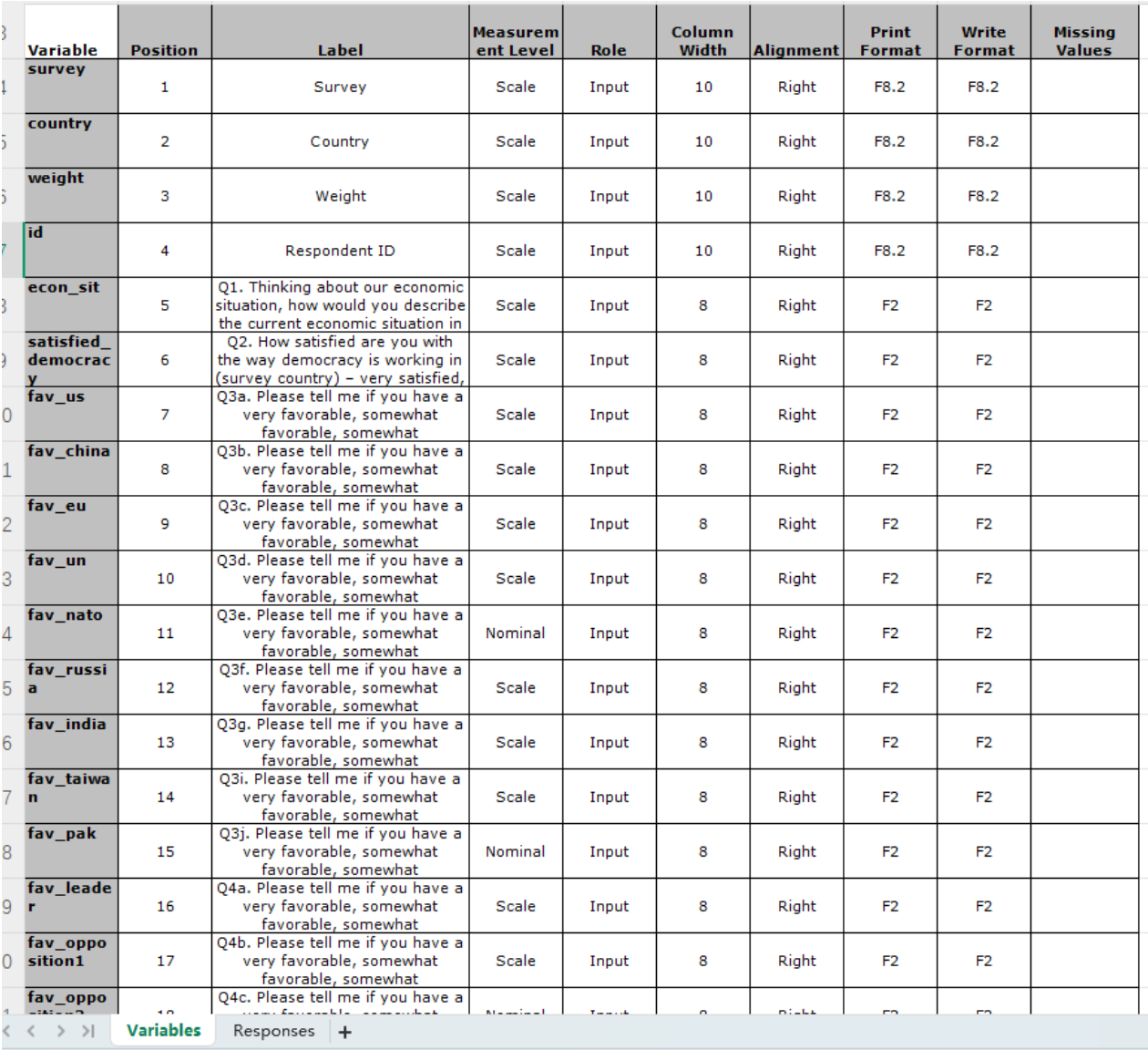 01、数据介绍皮尤发布了一项覆盖25个国家的民意调查报告,比较中国和美国的影响力。调查显示,中国不仅在多数国家的好感度呈现整体上升趋势,而且在许多国家民众的认知中,中国在经济影响力方面已超越美国,成为全球领先的强国。根据报告,在调查涉及的25个国家中,有15个国家对中国的好感度较去年有所提升。值得注意的是,中国在9个中等收入国家获得的好感度高于其在16个高收入国家的表现。数据名称:全球民意调查数据数据年份:2005-2023年02、数据指标Variable Position Label Measurement Level Role Column Width Alignment Print Format Write Format Missing Values03、