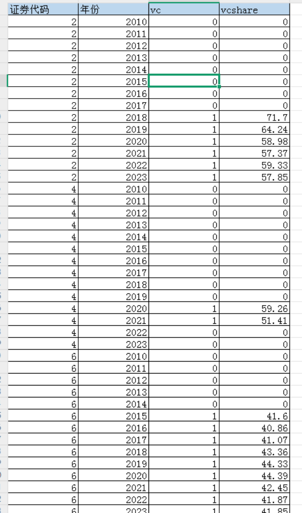 01、数据简介企业风险投资是指企业作为投资主体,利用自有资金或募集资金,对外部初创企业、新兴技术或创新项目进行股权投资,旨在通过战略协同、技术获取或财务回报,推动自身业务创新或产业布局。通过股权投资实现业务创新、技术获取或财务回报的资本运作方式,兼具战略协同与财务投资双重属性。本数据包含:原始数据、参考文献、代码do文件、最终结果数据名称:上市公司-风险投资数据数据年份:2010-2023年参考文献:[1]李志斌,李敏诗,许莲艳,等.风险投资与企业ESG表现[J].科学决策,2024,(04):1-21.02、相关数据证券代码、年份、vc、风投持股比例(vcshare)。03、