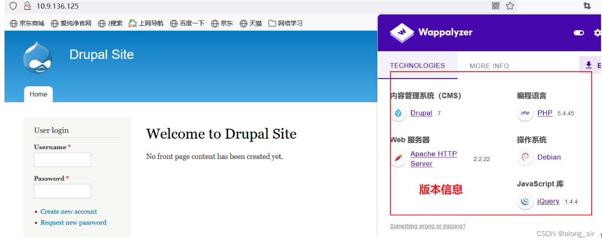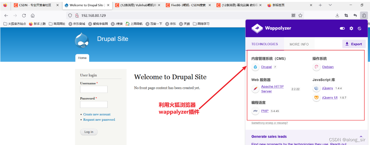 利用火绒插件wappalyzer,查看站点信息,系统为cms框架就是drupal
