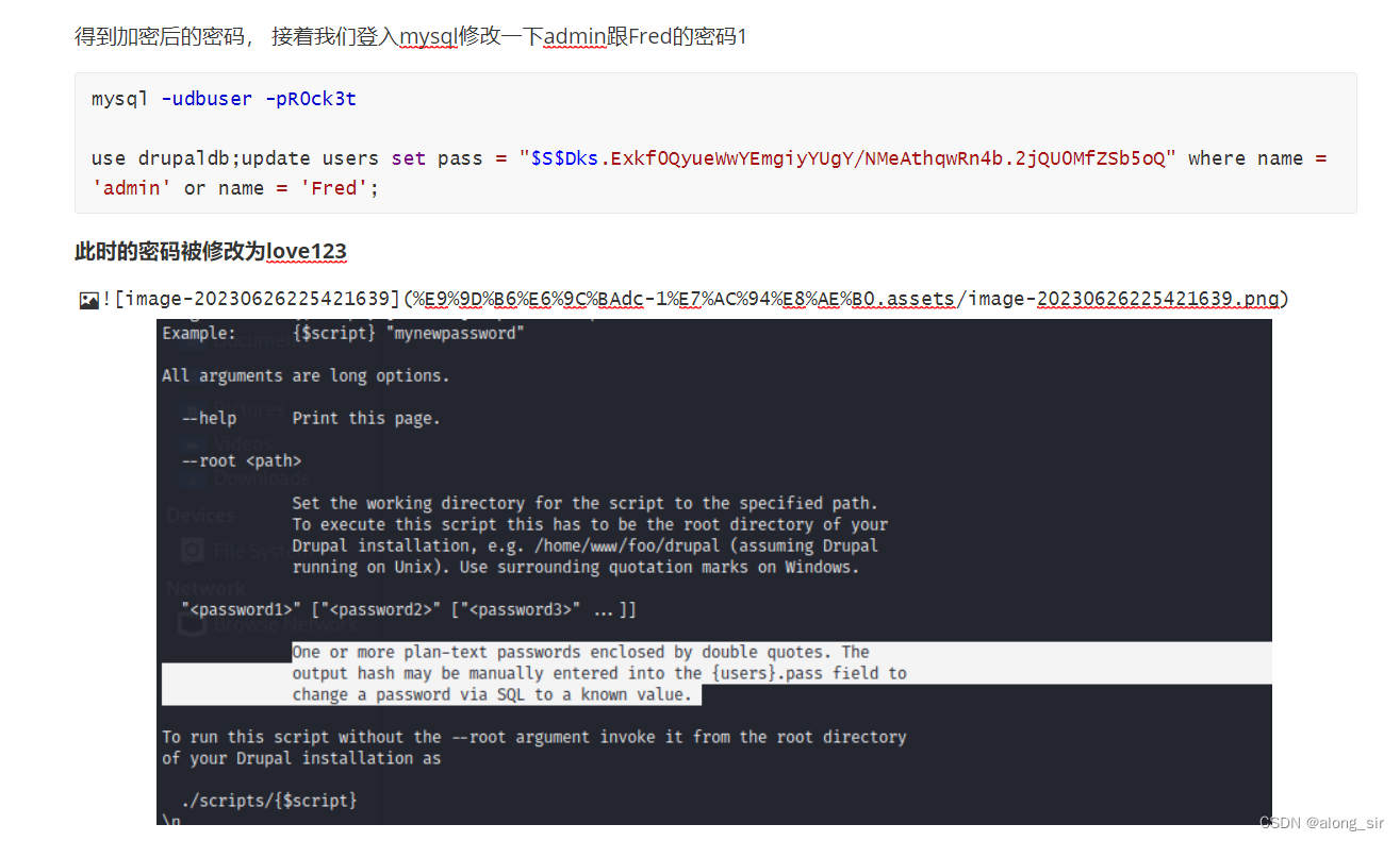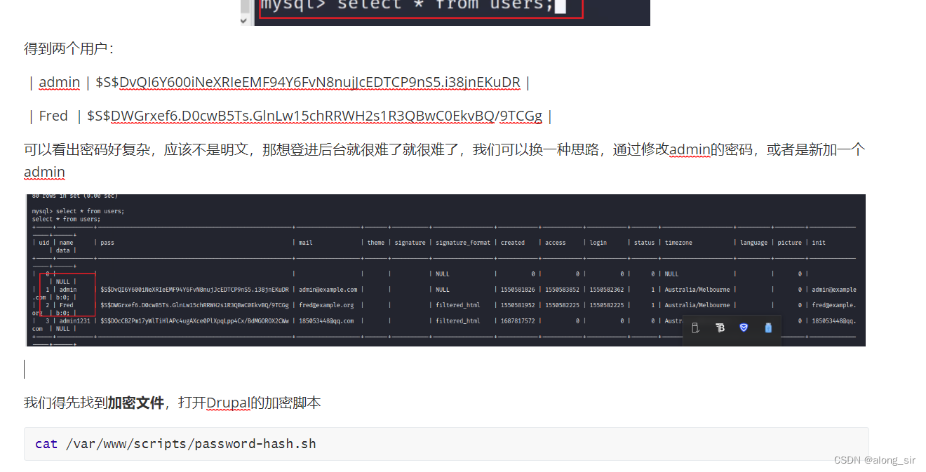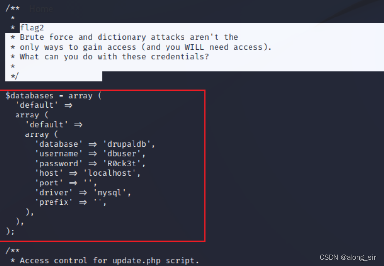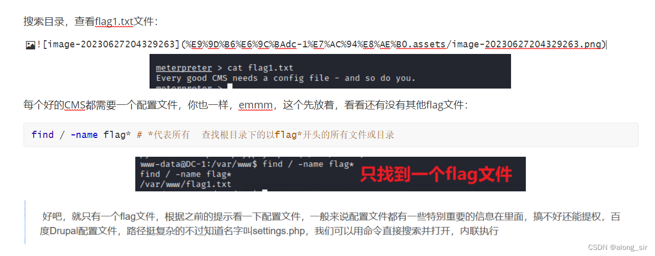 根据之前的提示看一下配置文件,一般来说配置文件都有一些特别重要的信息在里面,搞不好还能提权,百度Drupal配置文件,路径挺复杂的 不过知道名字叫settings.php,我们可以用命令直接搜索并打开,