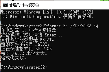 这种情况依然是因为 Windows 系统对 FAT32 格式的容量限制机制(默认不允许将超过 32GB 的分区格式化为 FAT32),即使通过命令行也会被拦截。64GB U 盘(实际可用约 58.2GB)超过了这个限制,就需要用第三方工具绕过系统限制来格式化,具体方法如下: