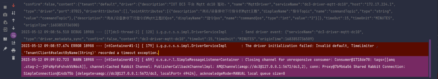 2023-05-12 09:08:57.674 ERROR 18988 --- [ntContainer#1-1] [ 179] i.g.p.c.s.s.impl.DriverServiceImpl : The driver initialization failed: Invalid default, TimeLimiter 'TenantClient#selectByName(String)' recorded a timeout exception.