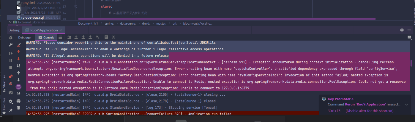 报错信息如下:Exception encountered during context initialization - cancelling refresh attempt: org.springframework.beans.factory.UnsatisfiedDependencyException: Error creating bean with name 'captchaController': Unsatisfied dependency expressed through field 'configService111'; nested exception is org.springframework.beans.factory.BeanCreationException: Error creating bean with name 'sysConfigServiceImpl': Invocation of init method failed; nested exception is org.springframework.data.redis.RedisConnectionFailureException: Unable to connect to Redis; nested exception is org.springframework.data.redis.connection.PoolException: Could not get a resource from the pool; nested exception is io.lettuce.core.RedisConnectionException: Unable to connect to 127.0.0.1:6379
