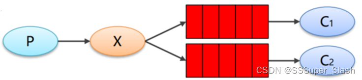X表示Exchange,即交换机。一方面,接收生产者发送的消息。另一方面,知道如何处理消息,例如递交给某个特别队列、递交给所有队列、或是将消息丢弃。到底如何操作,取决于Exchange的类型。Pub/Sub模式需要设置类型为 fanout 的交换机。