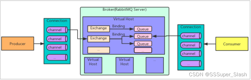 Virtual host:出于多租户和安全因素设计的,把AMQP的基本组件划分到一个虚拟的分组中,类似于网络中的namespace概念。当多个不同的用户使用同一个 RabbitMQ server 提供的服务时,可以划分出多个virtualhost,每个用户在自己的virtualhost创建exchange/queue等。