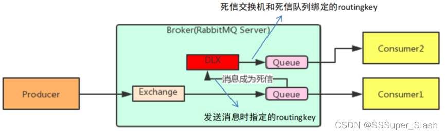 Dead Letter Exchange(死信交换机),当消息成为Dead message后,可以被重新发送到另一个交换机,这个交换机就是DLX。