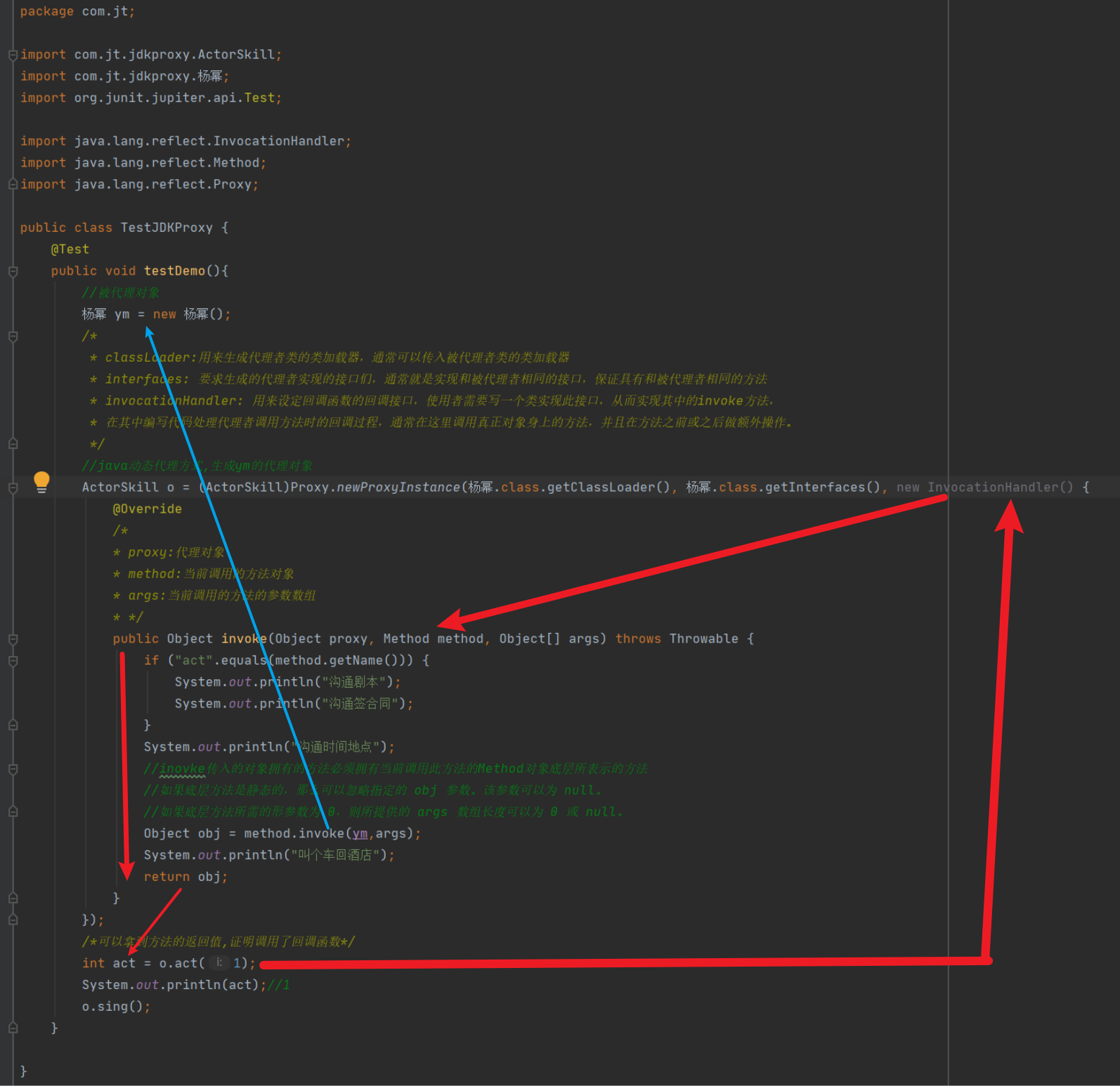 细看这个API最后一个参数,InvocatioanHandler是一个回调函数接口,实际需要传入的是它的一个实现类的对象(后称呼为a),在代理对象执行目标方法的时候,会过来执行回调函数,而此时代理对象并不能直接调用这个接口的实现类的回调函数,而是代理对象驱动着a去调用invoke方法,所以正真干活的应该是a;
