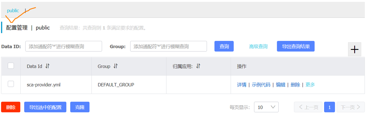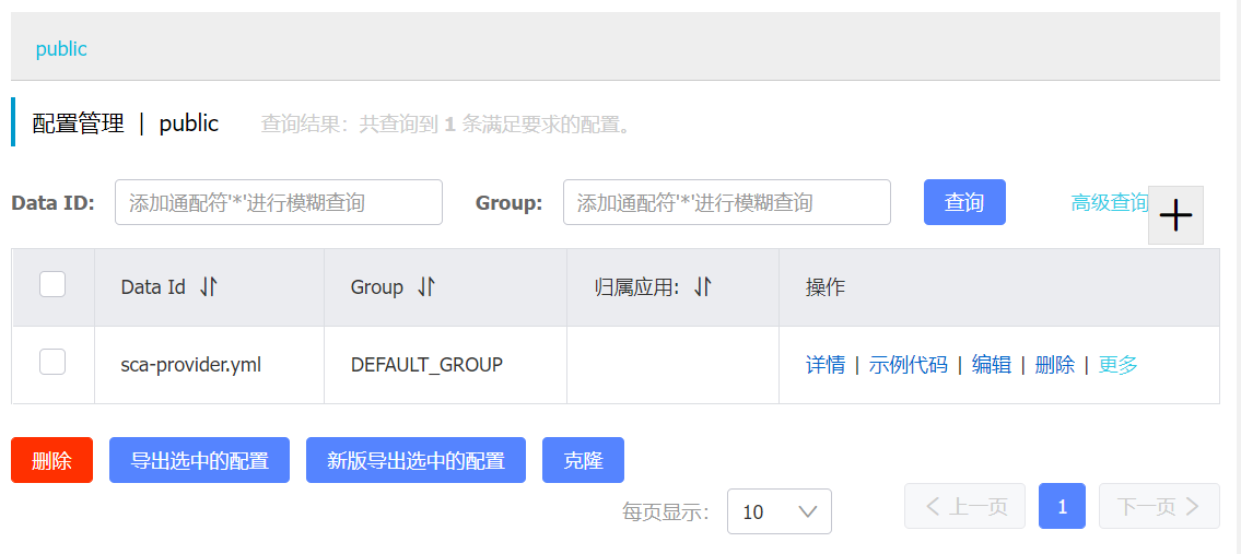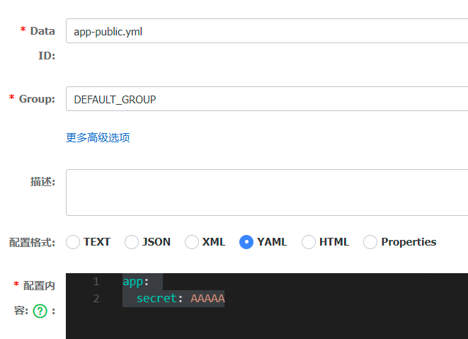 其中,Data ID的值要与bootstrap.yml中定义的spring.application.name的值相同(服务名-假如有多个服务一般会创建多个配置实例,不同服务对应不同的配置实例)。配置发布以后,会在配置列表中,显示我们的配置,例如: