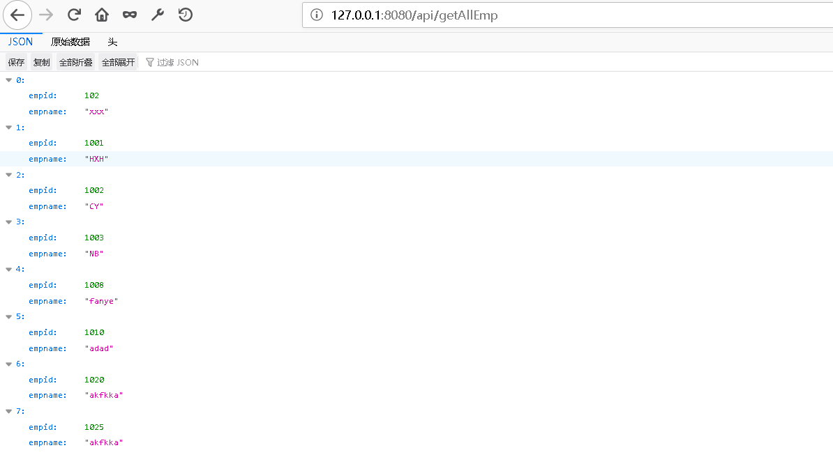 在地址栏输入地址即可看到从数据库查询到的数据以JSON格式返回到浏览器