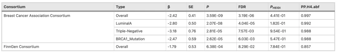 为了揭示连锁不平衡的混杂效应 [16],并检验基因与乳腺癌之间是否存在共享的因果变异,我们使用“coloc” R包进行共定位分析。分析设定了五种假设: