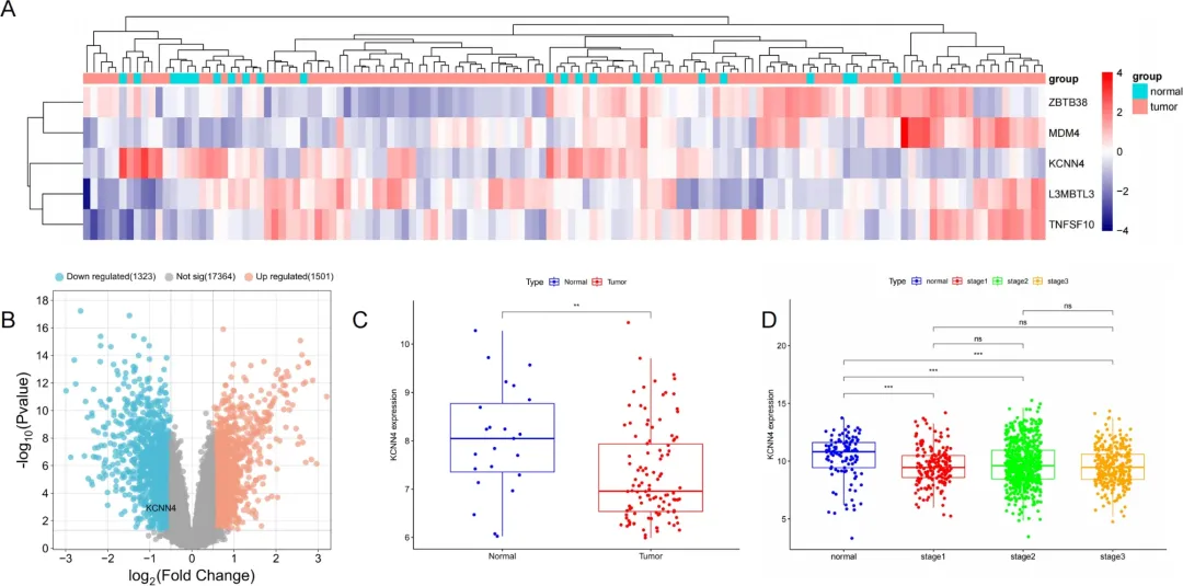 筛选了GSE162228的基因测序数据,鉴定出2824个与乳腺癌相关的差异表达基因(DEGs),其中包括1501个上调基因和1323个下调基因。团队发现KCNN4基因在肿瘤和正常组织之间表现出差异表达,这与SMR分析结果一致(log2FC = -0.735,P = 0.001)。乳腺癌样本中KCNN4的相对表达水平显著低于正常样本(P < 0.05)。这一结果与GEO数据库中的差异基因分析结果一致。