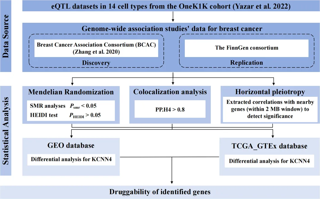 本研究利用Yazar等的eQTL数据及BCAC的GWAS数据,探索特定免疫细胞中基因表达与乳腺癌的潜在因果关联,并用FinnGen的GWAS数据验证结果。此外,通过bulkRNA-seq数据库进行差异基因表达分析,识别乳腺癌组织中的差异表达基因。