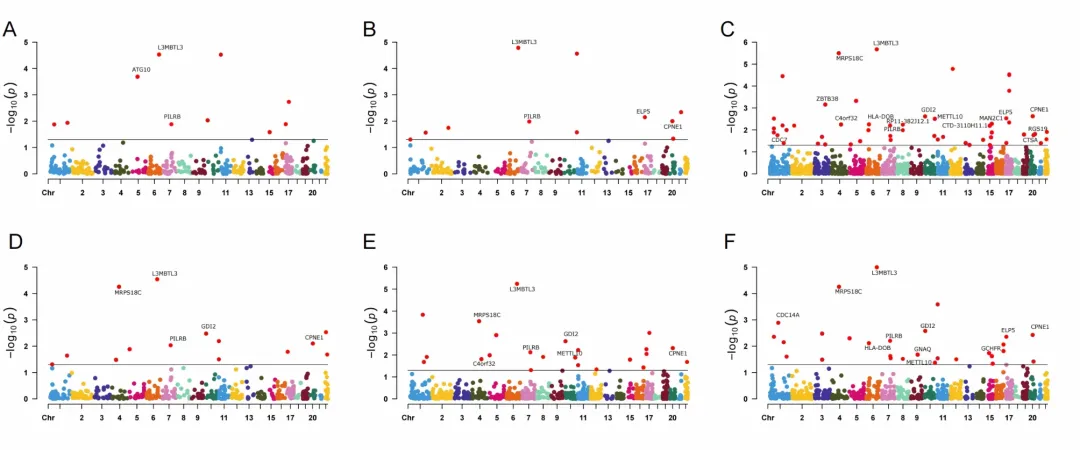 与整体乳腺癌相关的前三个基因为:CD4nc中的L3MBTL3(PFDR = 2.11 × 10⁻⁶)、CD4nc中的MRPS18C(PFDR = 3.19 × 10⁻⁶)和MONOnc中的KCNN4(PFDR = 3.19 × 10⁻⁶)。对于Luminal A型乳腺癌,前三个基因为KCNN4(PFDR = 4.04 × 10⁻⁵)、TNNT3(PFDR = 3.73 × 10⁻⁴)和SCAMP3(PFDR = 4.48 × 10⁻⁴)。对于三阴性乳腺癌,前三个基因为MDM4(PFDR = 2.50 × 10⁻⁷)和Bin(PFDR = 5.78 × 10⁻⁷)、RPS18(PFDR = 6.07 × 10⁻⁷)。BRCA-TN型乳腺癌的前三个基因为RPS18(PFDR = 6.59 × 10⁻⁹)、CD8nc(PFDR = 6.59 × 10⁻⁹)和MDM4(PFDR = 6.59 × 10⁻⁹)。其他亚型未发现显著基因。