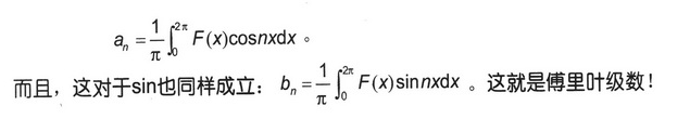 an,bn分别代表cosnx和sinnx的大小,幅度;cosnx和sinnx上面的n则代表周期,频率;