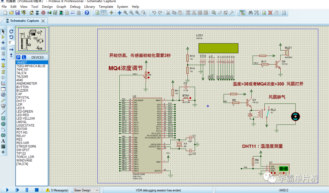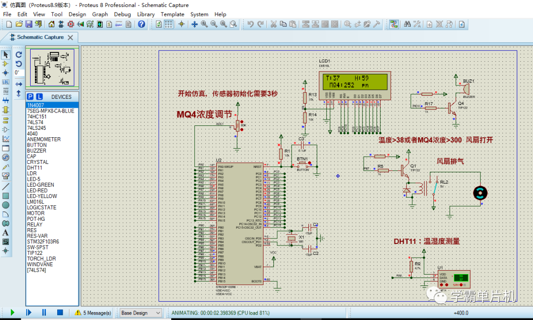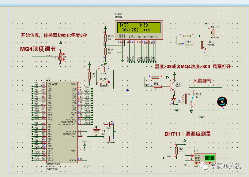 功能介绍:采用stm32单片机作为控制CPU,采用ADC采集天然气浓度,仿真中使用电位器调节天然气浓度,采用DHT11传感器采集温湿度,当天然气浓度或者温度大于一定值时,蜂鸣器报警,并且风扇打开进行排气,LCD1602显示屏显示相关数据,程序采用keil5编写,仿真使用Proteus8.9,并且程序有中文注释,新手容易看懂,文末有资料分享: