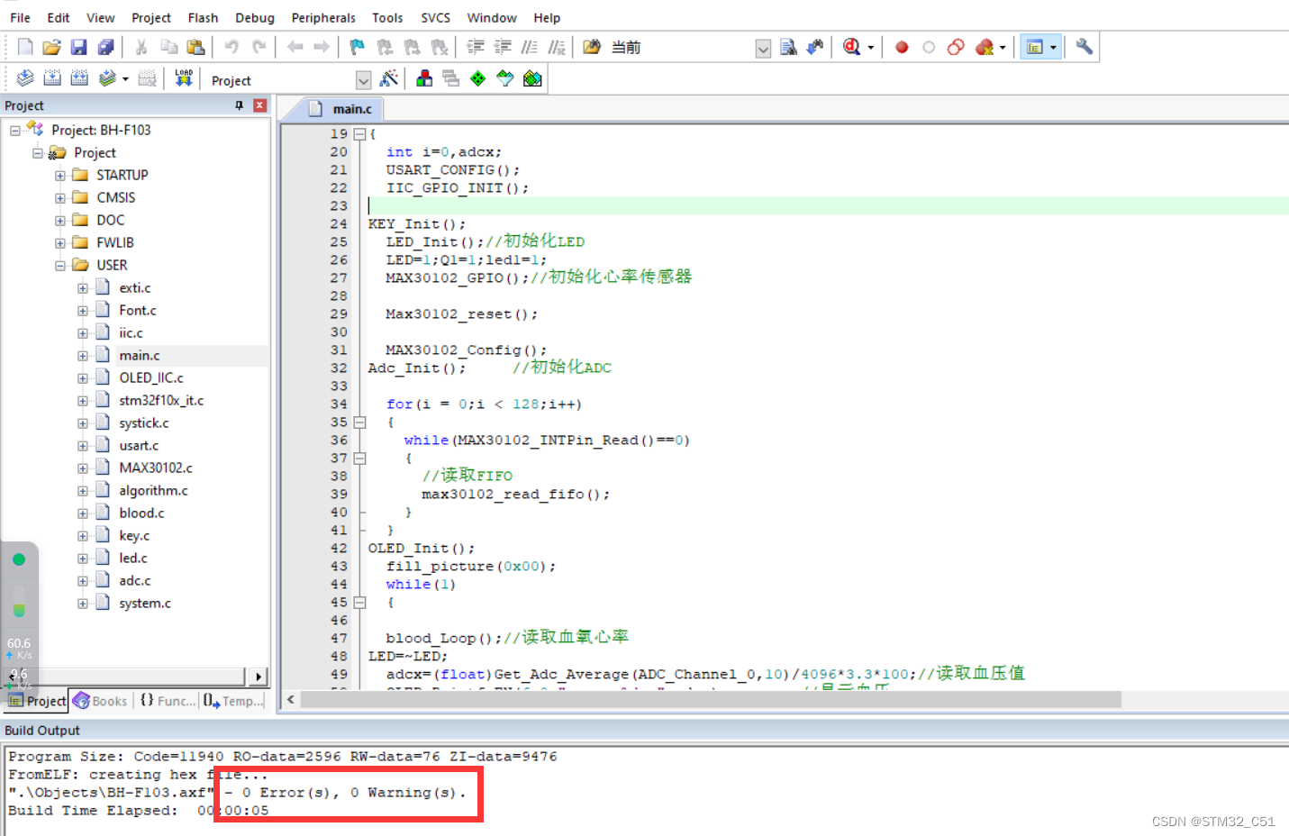 功能介绍:采用stm32单片机作为主控CPU,采用MAX30102模块采集心率和血氧,采用MSP20血压传感器采集血压,OLED显示相关数据,并且通过蓝牙模块HC-05上传到手机APP,当心率低于50或者血氧低于90%,蜂鸣器进行报警,文末有资料分享: