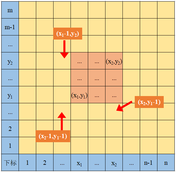 求解矩阵左下角a[x1][y1]a[x_1][y_1]a[x1][y1]到右上角a[x2][y2]a[x_2][y_2]a[x2][y2]的和,可以观察下图: