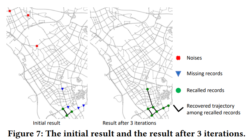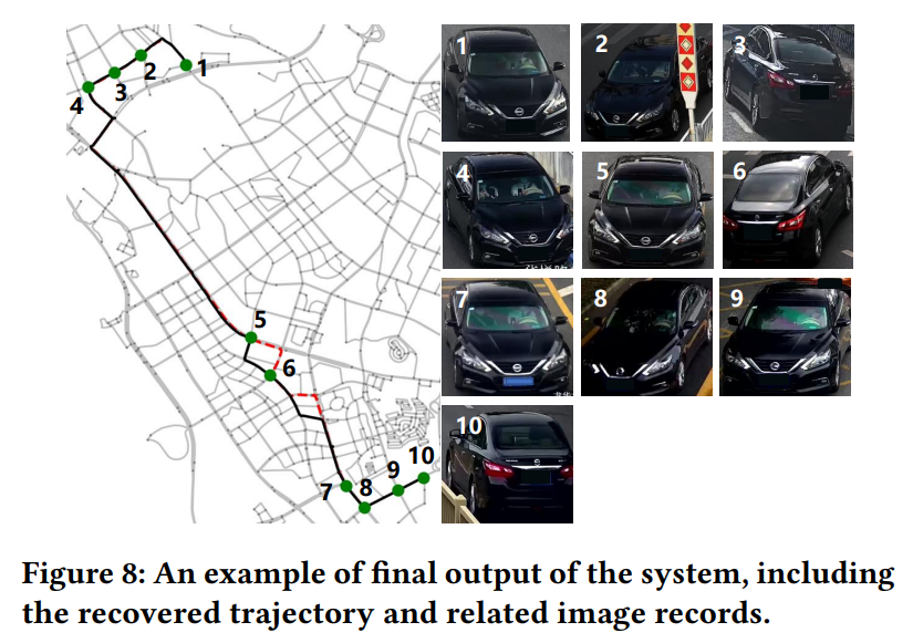 上图中展示了其中一个恢复的轨迹和相应的捕获图像。这10张抓拍图像都是从数百万条记录中检索得到的。通过比较地面真实值(红色虚线)和恢复的轨迹(黑色实线)可以看出,即使有距离很远的抓拍记录,车辆的大部分轨迹可以被正确恢复。