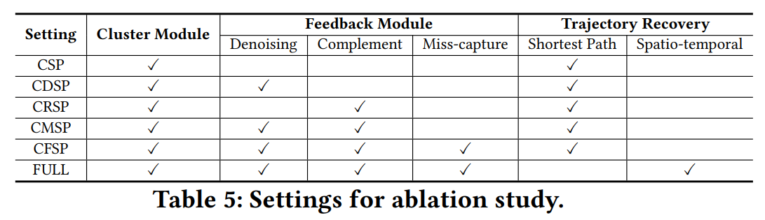 • 对比CSP和CDSP,我们可以看出去噪模块有效去除了噪声记录,聚类精度提高了4.1%,F1评分提高了2.0%。轨迹恢复结果也得到了改善。 • 与CSP相比,CRSP具有更高的召回率和F1评分。召回率提高了3.0%,F1评分提高了1.3%。但其精度稍低。因为合并簇的行为可能会引入一些噪声,这些噪声不仅在视觉上相似,而且具有较高的时空相似性。 • 在CSP、CDSP、CRSP和CMSP对比中,CMSP的召回率和F1得分最高。它结合了去噪和召回补充的性能,在下一次去噪迭代中去除了召回步骤中引入的噪声。并通过相机缺失抓拍的概率建模,CFSP进一步提升了效果。 • 在轨迹恢复结果中,FULL组合方式实现了上述所有设置的最佳性能。与CFSP相比,最大似然轨迹能够更好地反映现实驾驶行为和驾驶员的道路选择偏好,因此将时空信息引入到轨迹恢复中大大提高了结果的准确性。