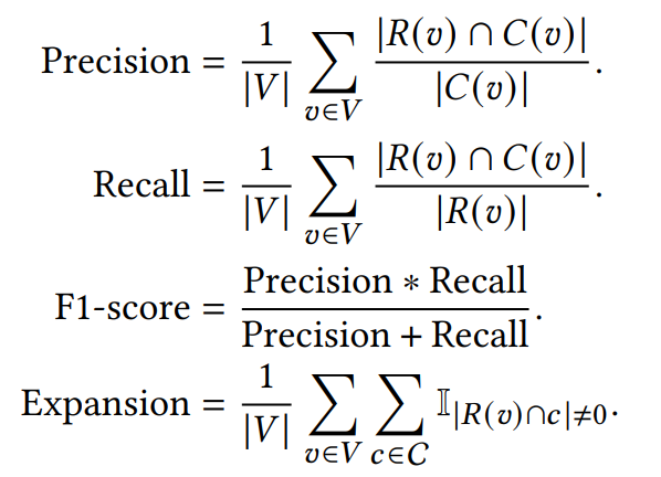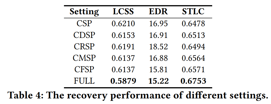 对于轨迹恢复的评估,使用最长公共子序列(LCSS)、实序列编辑距离(EDR)和时空线性组合距离(STLC)等公共度量。 由于恢复轨迹受聚类影响较大,作者还对聚类结果的精度、召回率、F1评分和扩展性进行了评价: