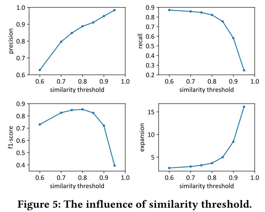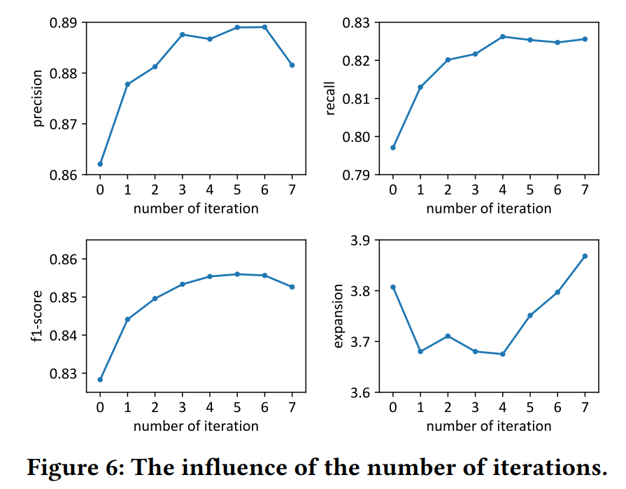 • 相似性阈值。将迭代次数固定为3,聚类相似度阈值范围设置为[0.6, 0.95]。结果如上图所示。精度和扩展度随相似度阈值单调增加,召回率单调降低,F1成绩先上升后下降。因此,适度的相似度阈值有助于在准确率和召回率之间实现适当的权衡,以获得更好的F1成绩。