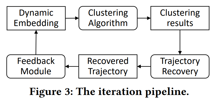 轨迹恢复模块将聚类结果作为输入,用于恢复最大后验轨迹。一方面,恢复轨迹的精度会受到聚类准确度的限制。错误聚类结果(噪声)越少,恢复的轨迹就越接近镇上的车辆轨迹。另一方面,恢复轨迹的不合理性也可以作为潜在噪声和聚类裂档的判断线索。所以作者设计了可迭代的优化流程,可以实现车辆重识别与轨迹恢复的协同优化,如下图所示。