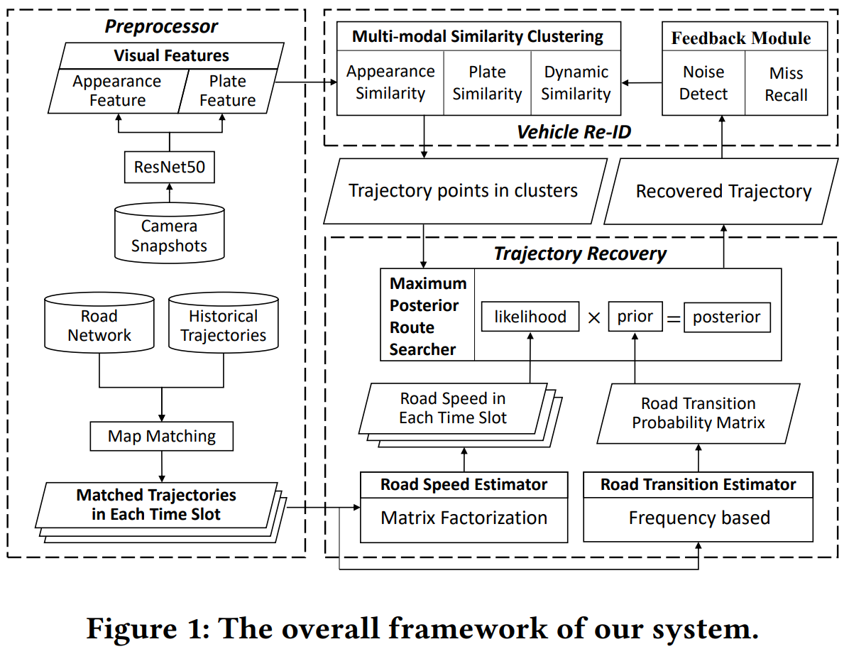 作者通过交通相机抓拍数据、历史的车辆GPS轨迹数据、路网数据等三种数据恢复出路口级的车辆轨迹。 论文的方法框架由预处理模块、车辆重识别模块和轨迹恢复模块三部分组成,如下图所示。