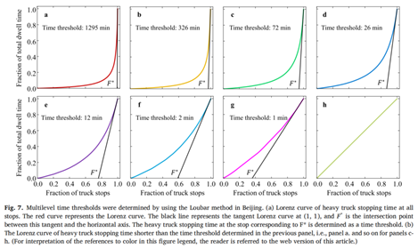 使用一种非参数迭代方法——Loubar方法来确定多级时间阈值:首先使用第2.1节中介绍的方法来识别所有卡车的驻留点。然后,按停车时间降序,计算重卡在驻留点的累计停车时间。最后,对排序的卡车驻留点的编号和相应的累积停止时间进行归一化,绘制出洛伦兹曲线,如图7a所示。