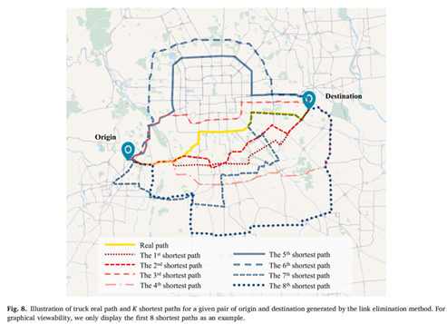 为了测量卡车单次行程轨迹的绕行程度,需要提取真实的轨迹进行分析。使用卫星图像对卡车GPS轨迹进行分析,手动标注一些重卡轨迹的真值。例如,卡车装卸地点,如工厂、仓库、码头等往往具有明显的建筑特点,可以从卫星图像中识别出来。针对每次行程的轨迹,生成起终点之间K条最短路径,用于度量城市中重卡单次行程路径的绕行程度。