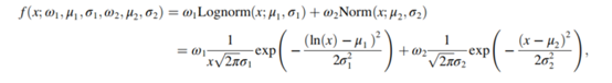 本文假设平均速度分布的右峰值反映重卡在道路上行驶时的速度特征,而左峰值主要是由GPS漂移引起的。将静止重卡在GPS数据漂移影响下的速度值定义为GPS漂移速度。本文使用了下式混合分布来拟合城市重卡的平均速度: