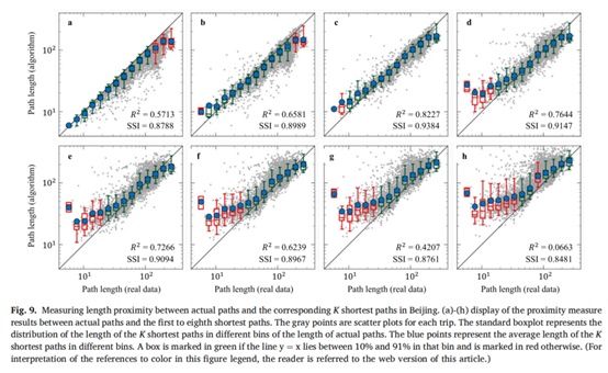 以北京为案例,手动标注了近2000辆重卡单次旅行的起终点。使用链路消除方法生成从起点到终点的K条最短路径。使用Sørensen相似度指数(SSI)找到长度上最接近原始路径的第n条最短路径。图9为北京实际行程路径与对应的8条最短路径之间的长度相似度测量结果。发现第三条最短路径(具有最大的SSI值和R2)适用于测量北京重卡单行程路径的绕行程度。对于分割子轨迹,在城市道路网中生成从起点到终点的第三条最短路径。如果子轨迹的长度大于相应的第三条最短路径,则认为由多次行程组成。然后,使用下一个较短的时间阈值从该子轨迹中识别潜在的行程终点。