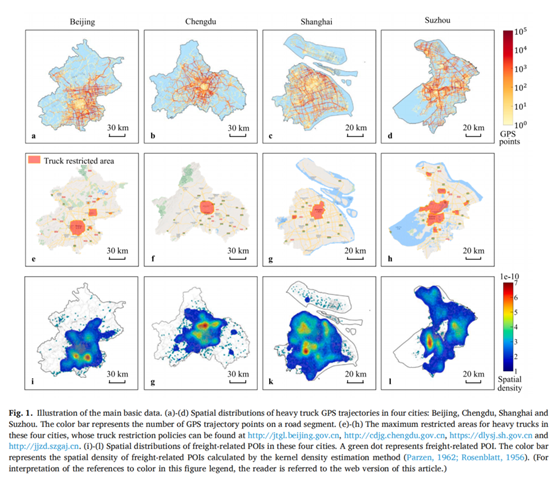 本文以城市道路网为基础数据,度量城市重卡轨迹的绕行程度,剔除道路上的临时停车。使用OSMnx包获取城市道路网,坐标系为WGS-84。城市道路网用有向图表示,其中边表示路段,节点表示交叉口,每条边的权重是路段长度。根据不同城市的货运政策,人口密度高的中心地区往往被管制为重型卡车限制区(见图1e-h)。在限行时段,重卡无法到达这些区域,删除了限行区域内的路段,以建立不同时段的重卡通行的多个路网。