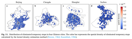 图11为利用中国北京、成都、上海和苏州四个城市的城市道路网和货运相关POI数据剔除的临时驻留点的分布示例。结果表明,大部分被剔除的临时驻留点位于高速公路和市中心的主干道上,这些道路交通拥堵,容易导致临时驻留点。
