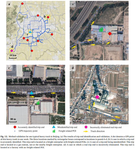 使用与货运相关的POI从已识别的行程终点中剔除非实际的行程终点,以提高精度。