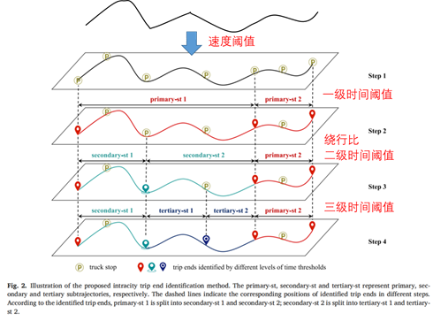 Step2,确定多级时间阈值,并根据重卡的最大停车时间选择一个合适的时间阈值,从重卡驻留点中确定行程终点。例如,如果第一级(最大)时间阈值小于此卡车的最大停止时间,则选择该时间阈值。否则,将选择另一个较短的时间阈值,以确保识别到行程终点。然后,根据确定的行程终点将GPS轨迹分成多个一级子轨迹(primary-st);