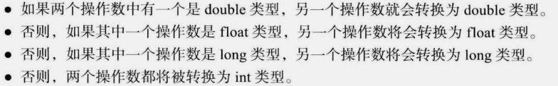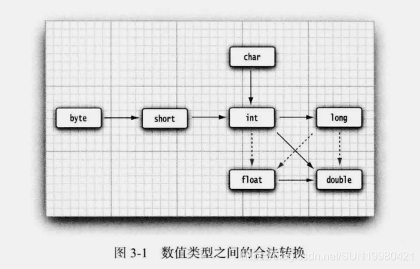 经常需要将一种数值类型转换为另一种数值类型。图3-1给出了数值类型之间的合法转换。在图3-1中有6个实心箭头,表示无信息丢失的转换;有3个虚箭头,表示可能有精度损失的转换。