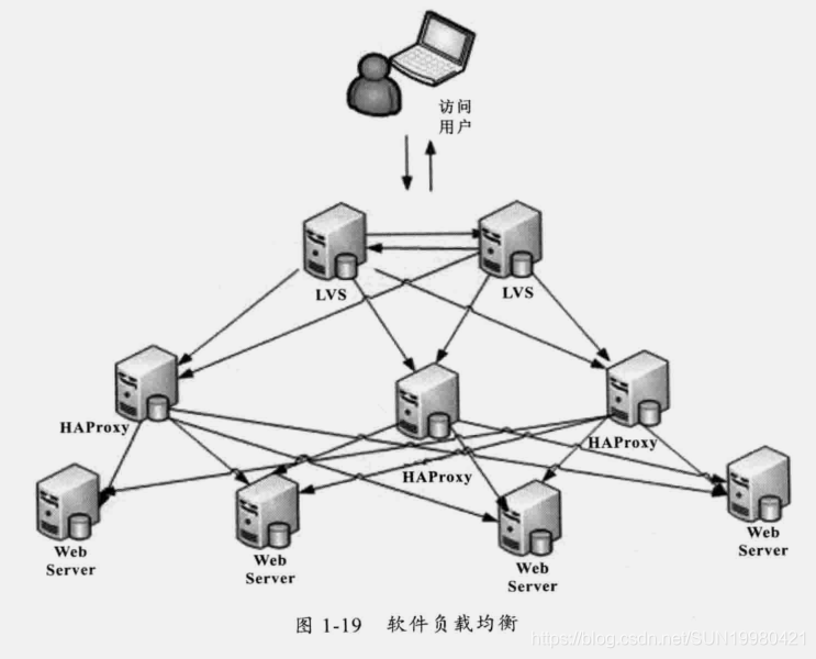 图1-19中上面两台是LVS,使用4层负载均衡,也就是在网络层利用IP地址进行地址转发。下面的三台使用HAProxy进行七层负载,也就是可以根据访问用户的HTTP请求头来进行负载均衡,如可以根据不同的URL来将请求转发到特定机器或者根据用户的Cookie信息来指定访问的机器。