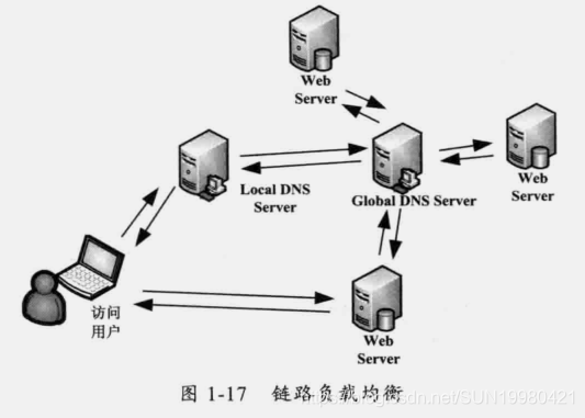 负载均衡是由DNS的解析来完成的,用户最终访问哪个Web Server是由DNS Server来控制的,在这里就是由Global DNS Server来动态解析域名服务器。这种DNS解析的优点是用户会直接访问目标服务器,而不需要经过其他代理服务器,通常访问速度会更快。但是也有缺点,由于DNS在用户本地和Local DNS Server都有缓存,一旦某台Web Server挂掉,就很难及时更新用户的域名解析结构。如果用户的域名没有及时更新,那么用户将无法访问这个域名,带来的后果非常严重。