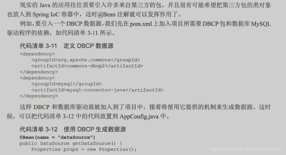 有时候Bean的定义可能使用的是第三方的类,此时可以使用注解@Bean来配置自定义初始化和销毁方法,如下所示: