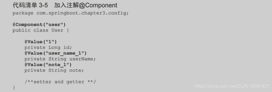 这里的注解@Component表明这个类将被Spring IoC容器扫描装配,其中的配置“user”则是作为Bean的名称,如果不配置这个字符串,那么IoC容器就会把类名第一个字母作为小写,其他不变作为Bean名称放入到IoC容器中;注解@Value则是指定具体的值,使得Spring IoC给与对应的属性注入对应的值。