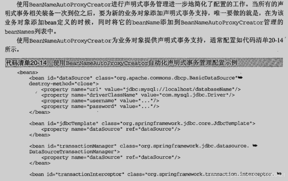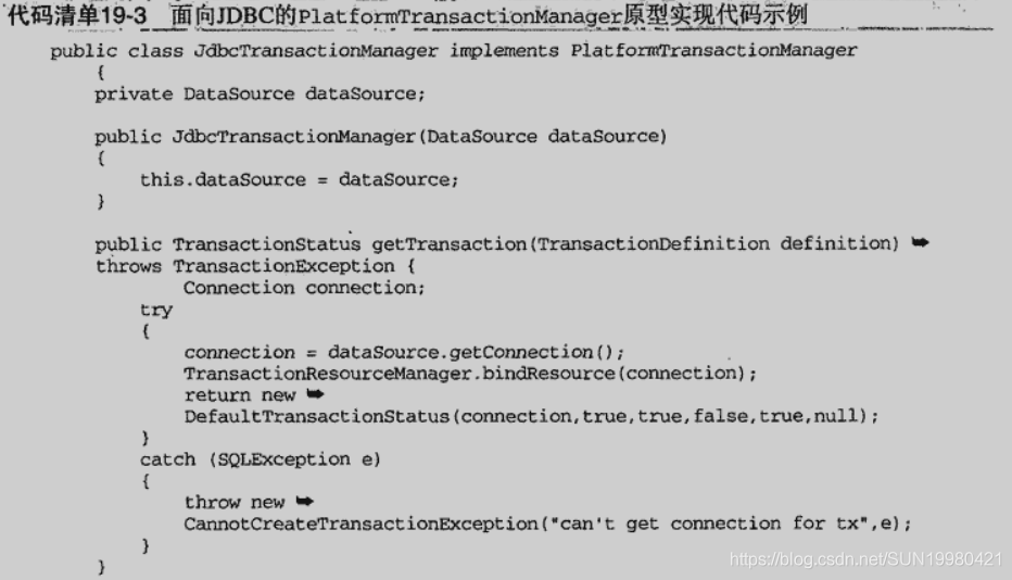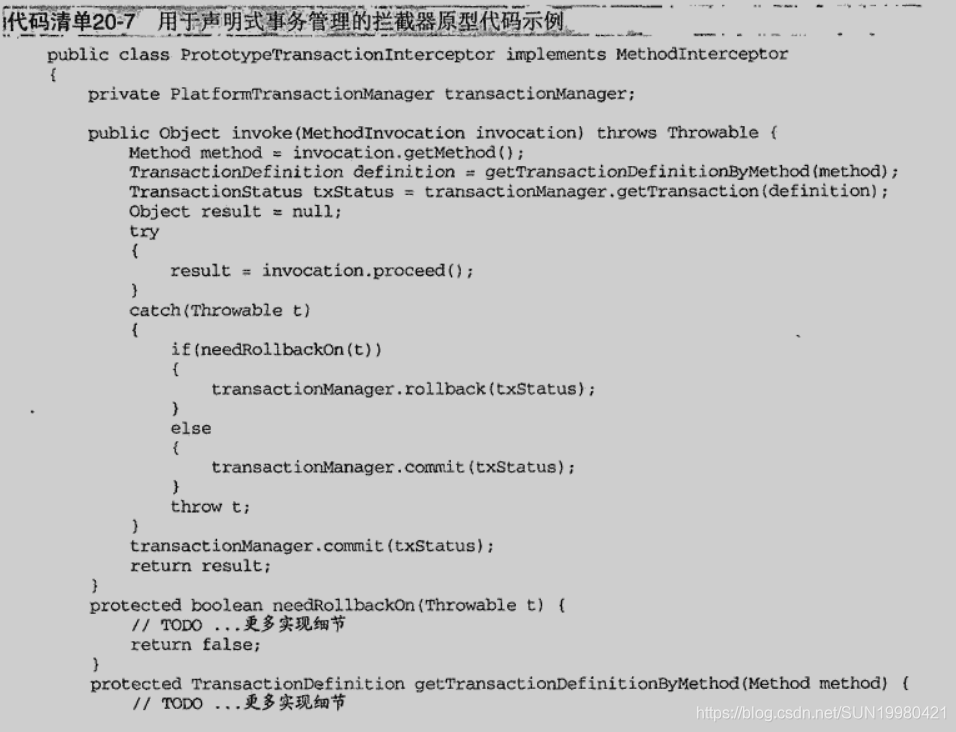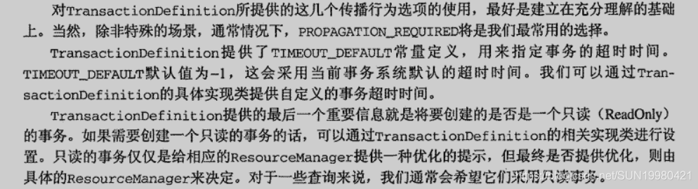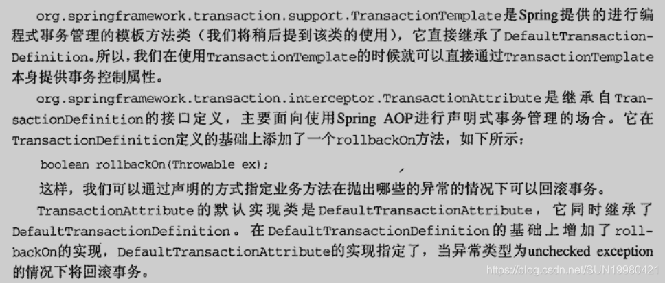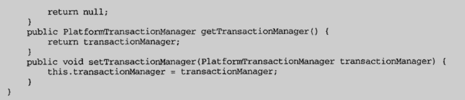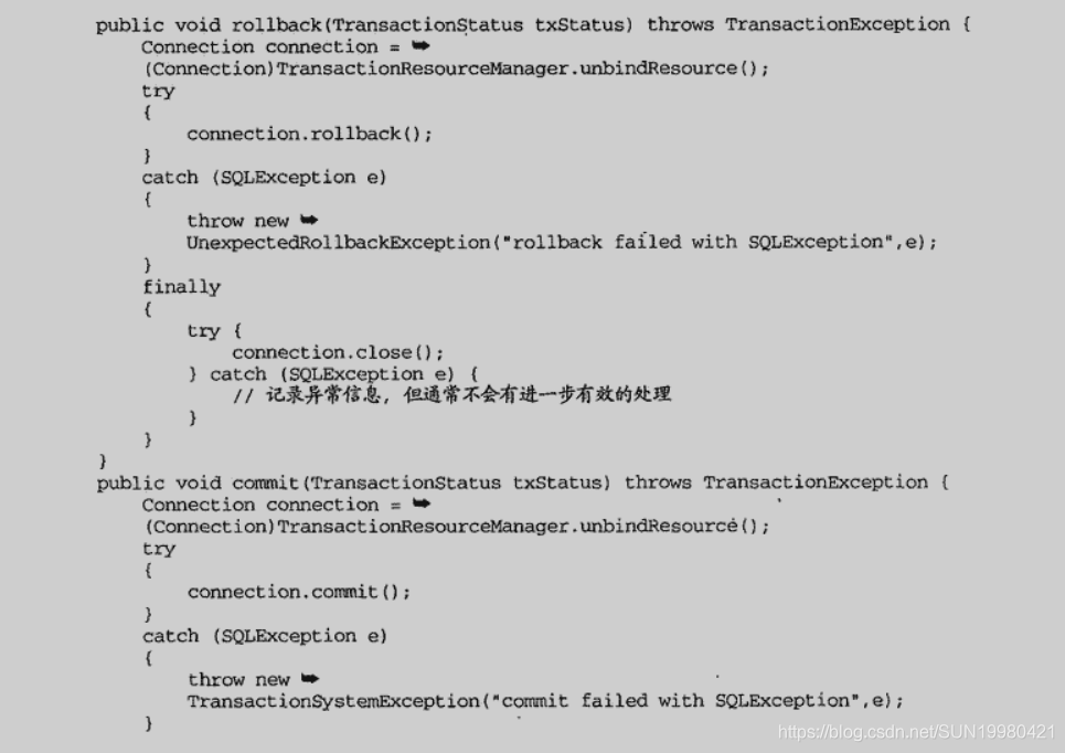 //直接使用PlatformTransactionManager进行编程事务管理的代码示例 DefaultTransactionDefinition definition = new DefaultTransactionDefinition(); definition.setTimeout(20); ... TransactionStatus txStatus = transactionManager.getTransaction(definition); try{ // 业务逻辑实现 } catch(ApplicationException e) { transactionManager.rollback(txStatus); throw e; } catch(RuntimeException e) { transacitonManager.rollback(txStatus); throw e; } catch(Error e) { transactionManager.rollback(txStatus); throw e; } transactionManager.commit(txStatus);只要为transactionManager提供合适的PlatformTransactionManager实现,然后结合TransactionDefinition开启事务,并结合TransactionStatus来回滚或者提交事务,就可以完成针对当前对象的整个事务管理。